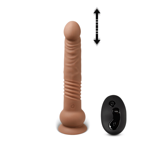 Brown Color 10 Functions Remote Control Silicone Rechargeable Vibrating and Thrusting Dildo, with one-key burst for maximum enjoyment, skin safe, Phthalates and Latex Free.